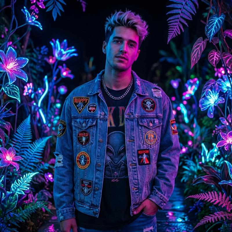 Neon Gardensitting among giant glowing mushrooms and luminescent flowers in a neon garden at night, face lit by the ethereal plant-light, fantastical and enchanting atmosphere