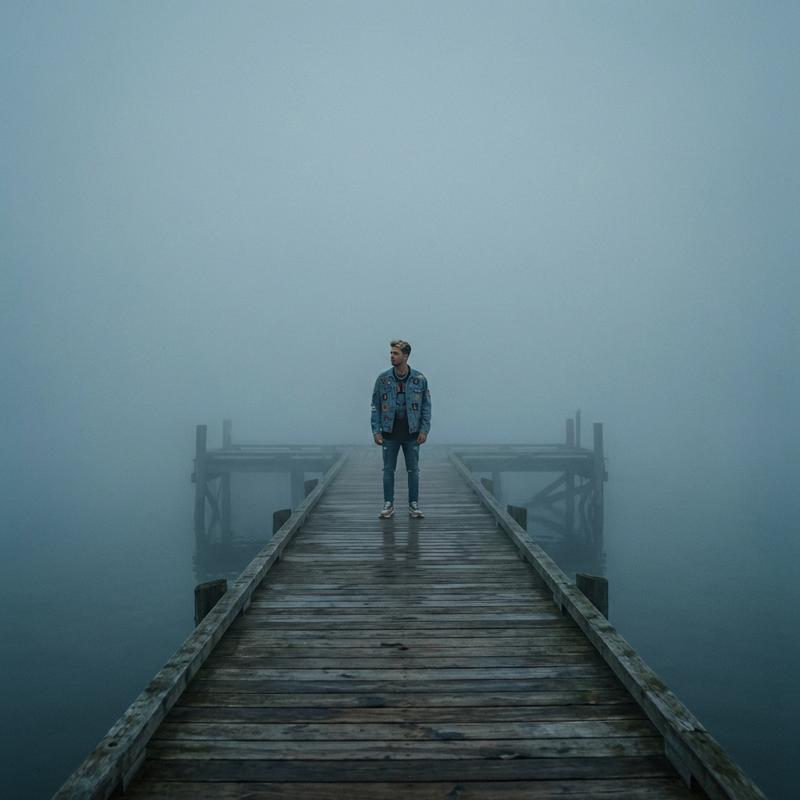 Neon Underpassstanding at the end of a long wooden pier disappearing into thick fog, muted gray-blue tones, barely visible water below, solitary figure, moody and atmospheric, cinematic mystery, minimal composition