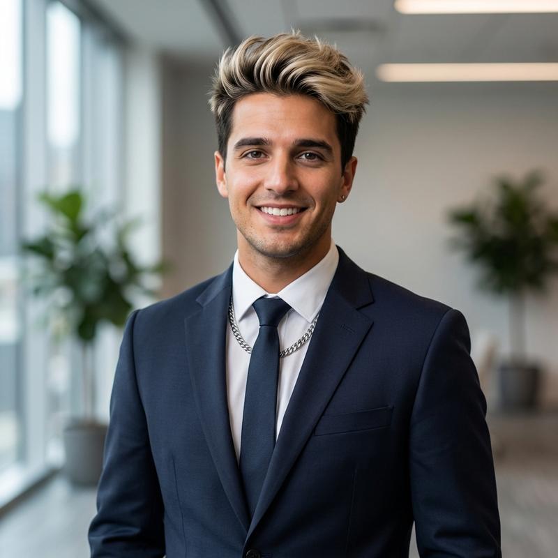 Casual Professionalprofessional executive headshot in a modern office, wearing a tailored dark suit, confident and approachable expression, soft studio lighting, neutral blurred background, sharp focus on face, corporate photography style
